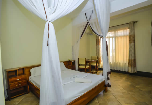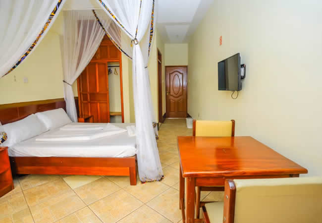 DOUBLE ROOM (comes with a “5×6” bed-size with a mosquito net, night stand with a phone, Fridge, TV with DSTV or Cable, heated water for showers and a sitting toilet.